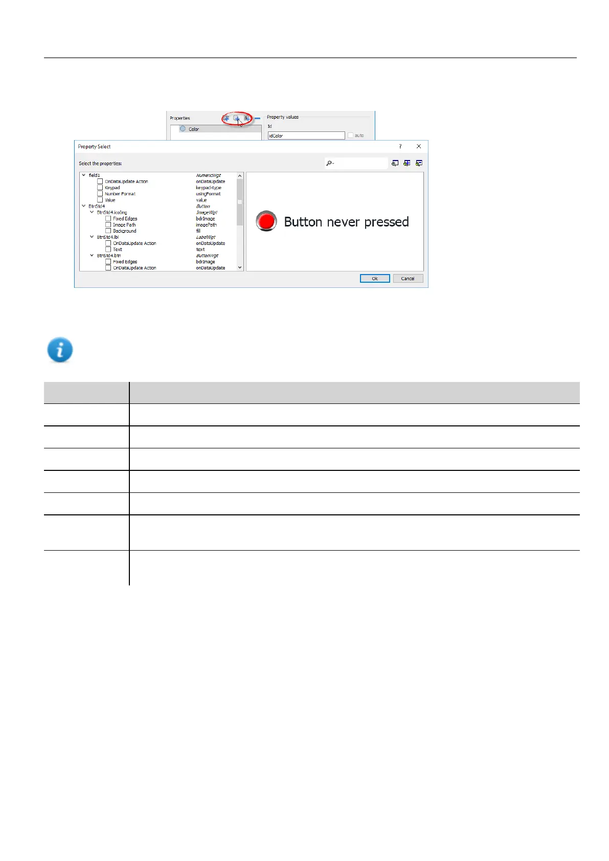 2. Click + to open the Property Select dialog: this lists all the properties of all the grouped widgets.
