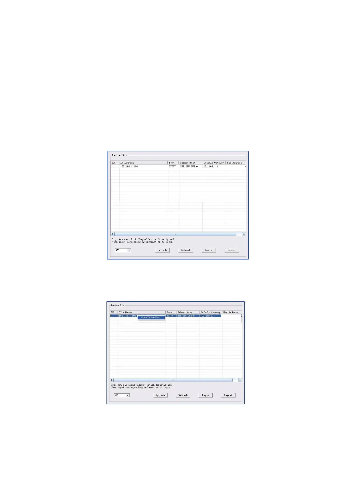 In the device list interface, you can view device IP address, port number, subnet mask, default