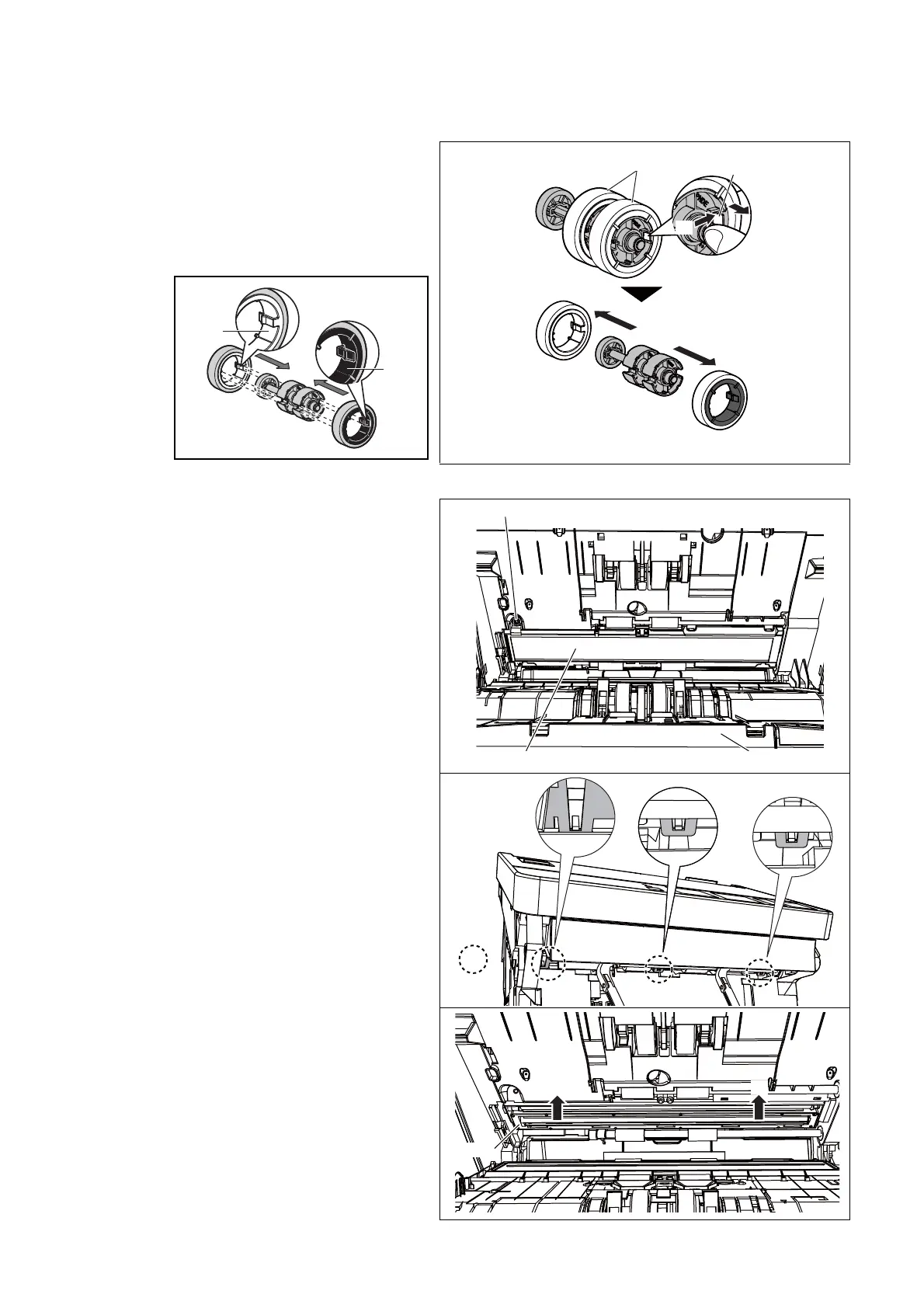 (2) Push the tab (arrow 1) to remove the Feed Roller.