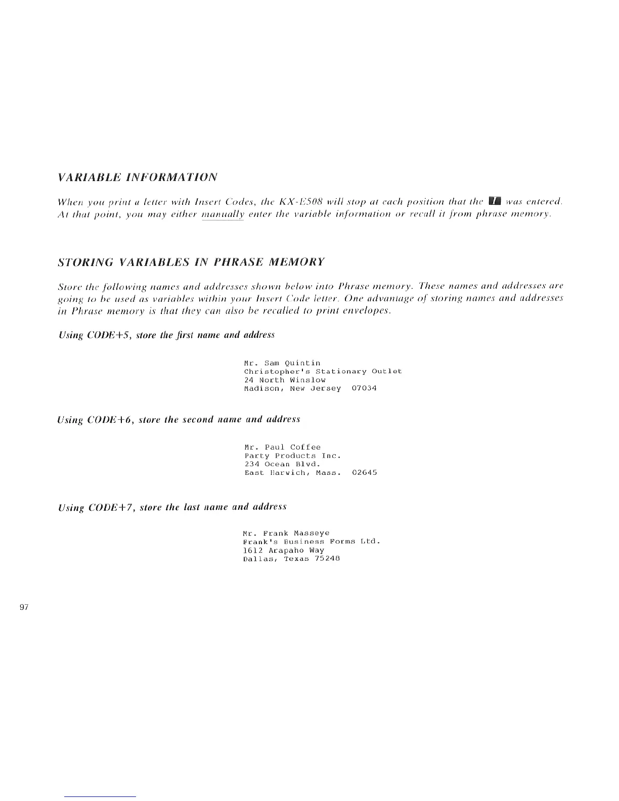 Panasonic KX-E50 - Variable Information; Storing Variables in Phrase Memory