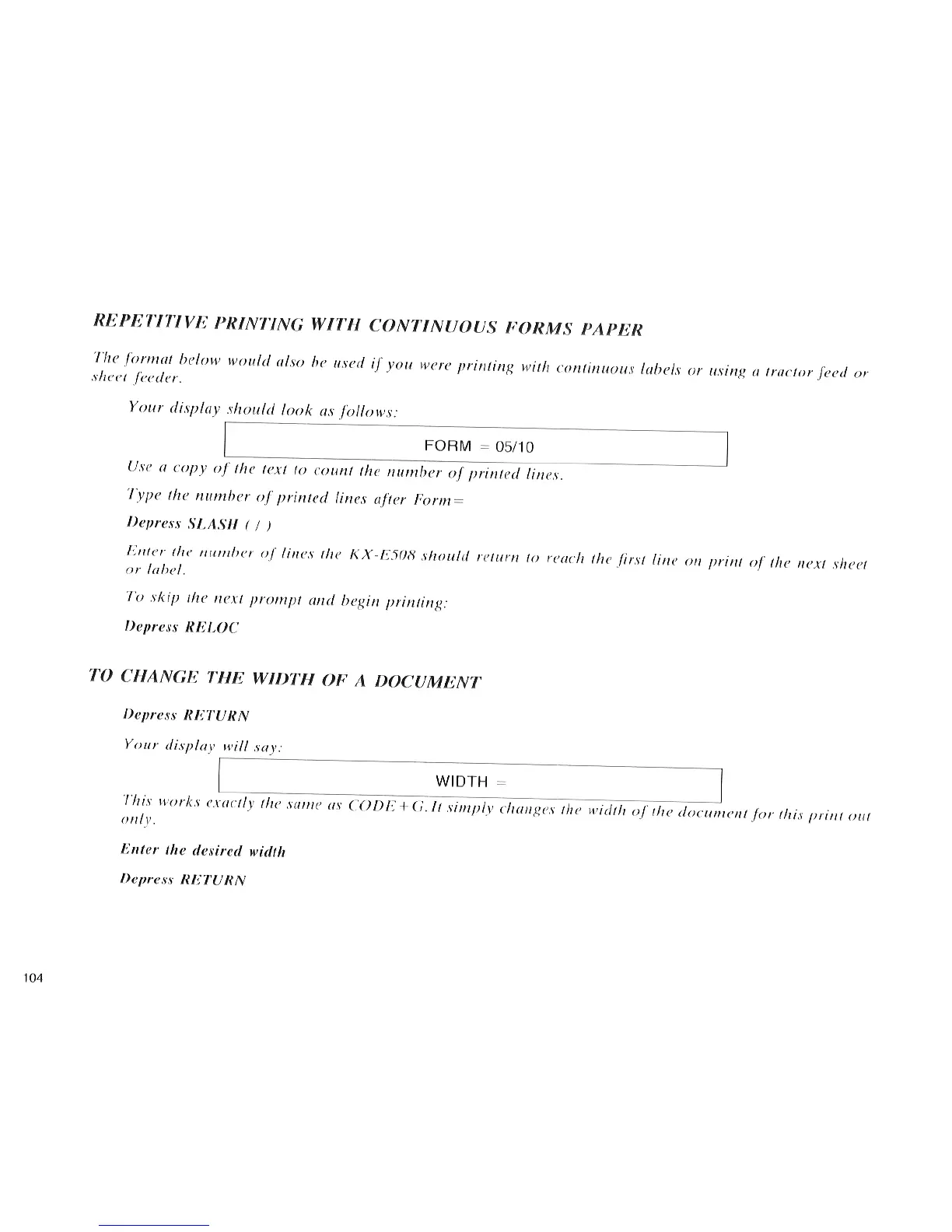 Panasonic KX-E50 - Repetitive Printing with Continuous Forms Paper; To Change the Width of a Document