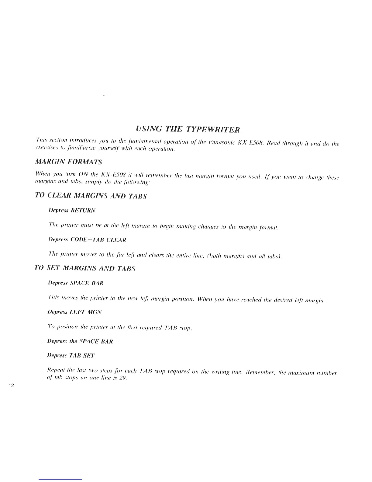 Panasonic KX-E50 - Using the Typewriter; Margin Formats; To Clear Margins and Tabs; To Set Margins and Tabs