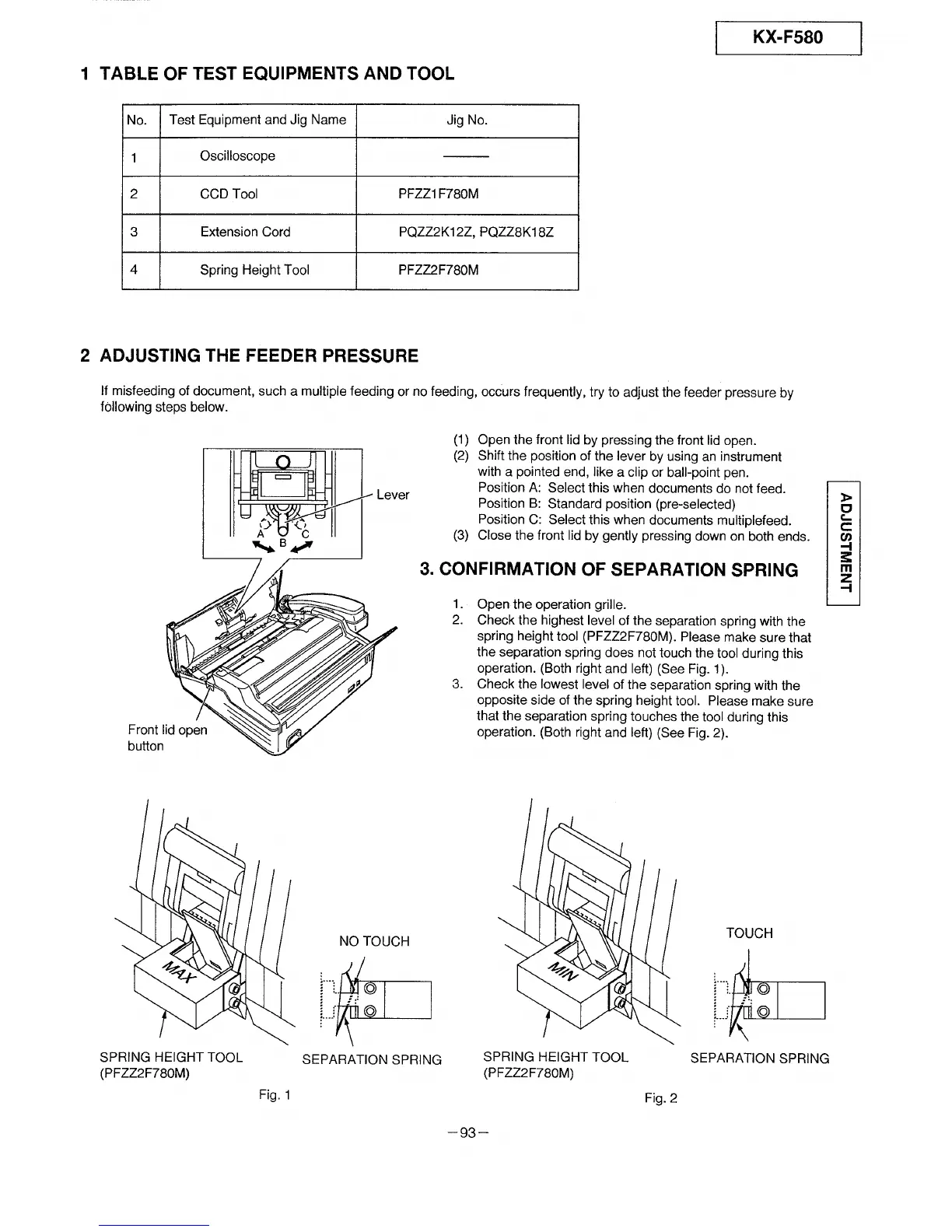 Panasonic KX-F780 - Table of Test Equipments and Tools; Adjusting the Feeder Pressure; Confirmation of Separation Spring