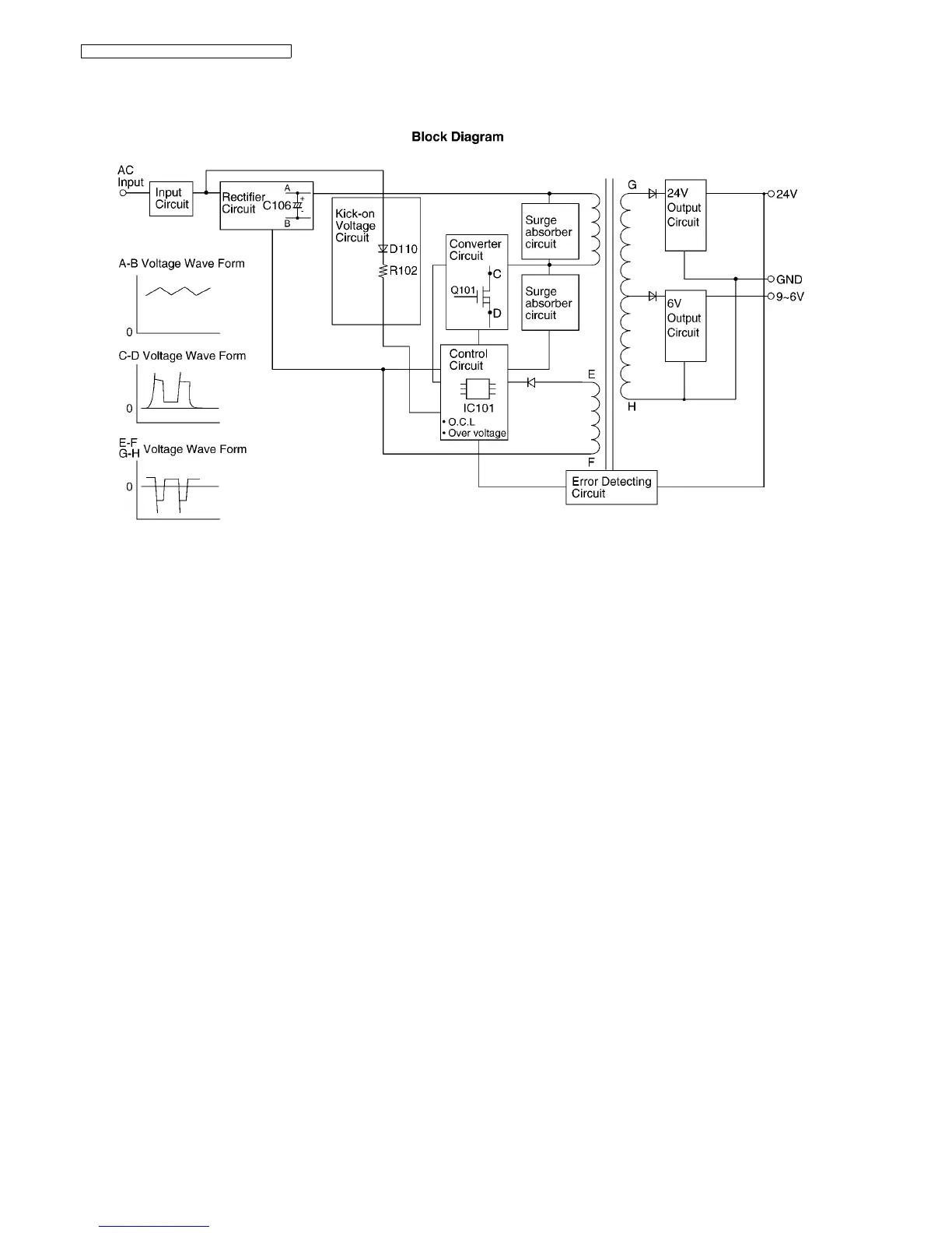 The input current is rectified by D101,D102,D103 and D104 and charges C106 to make DC voltage. Then it supplies power to the