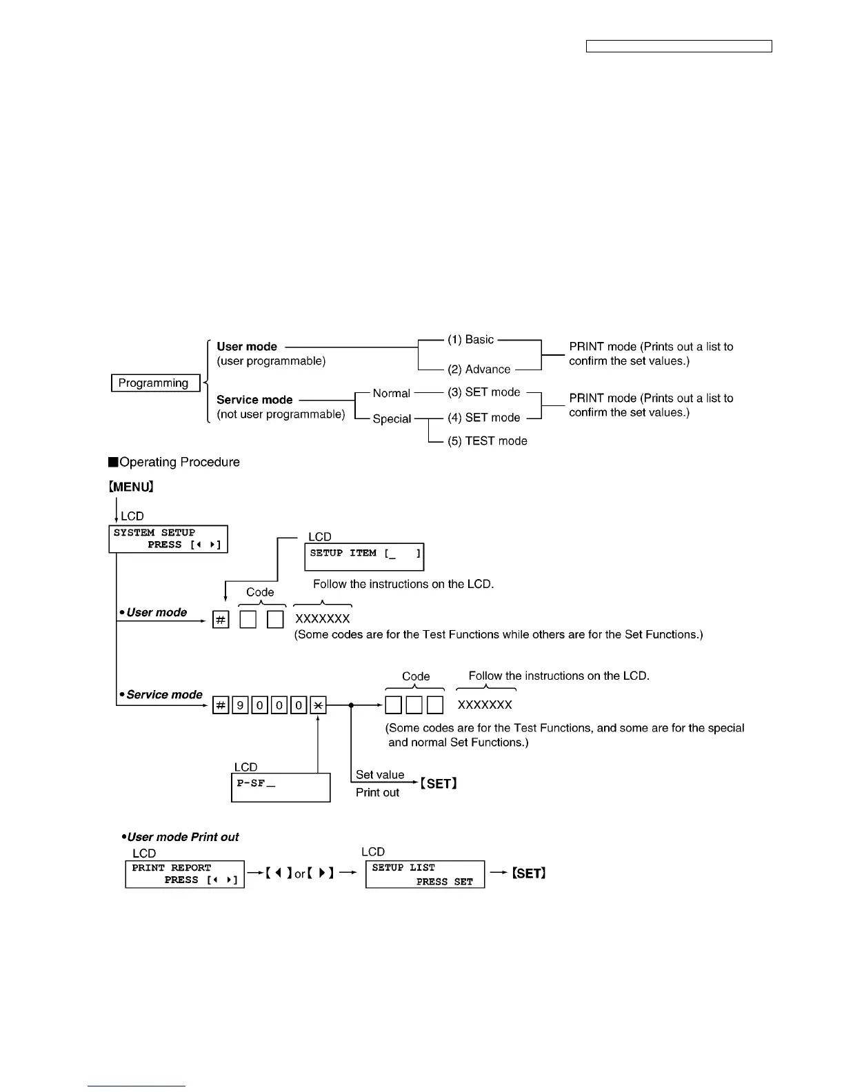 There are 2 basic categories of programming functions, the User Mode and the Service Mode. The Service Mode is further bro-