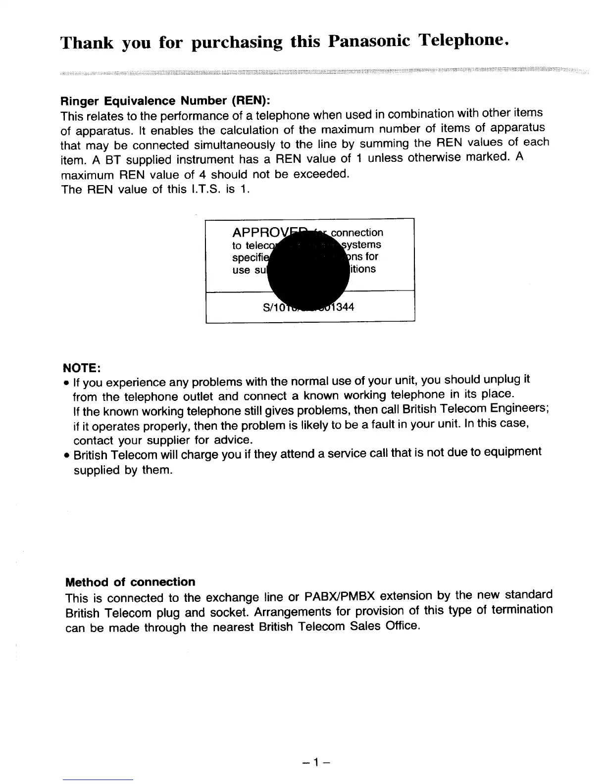 Panasonic KX-T2365E - Telephone Connection and Regulatory Information; Ringer Equivalence Number (REN); Method of Connection; Important Notes and Warnings