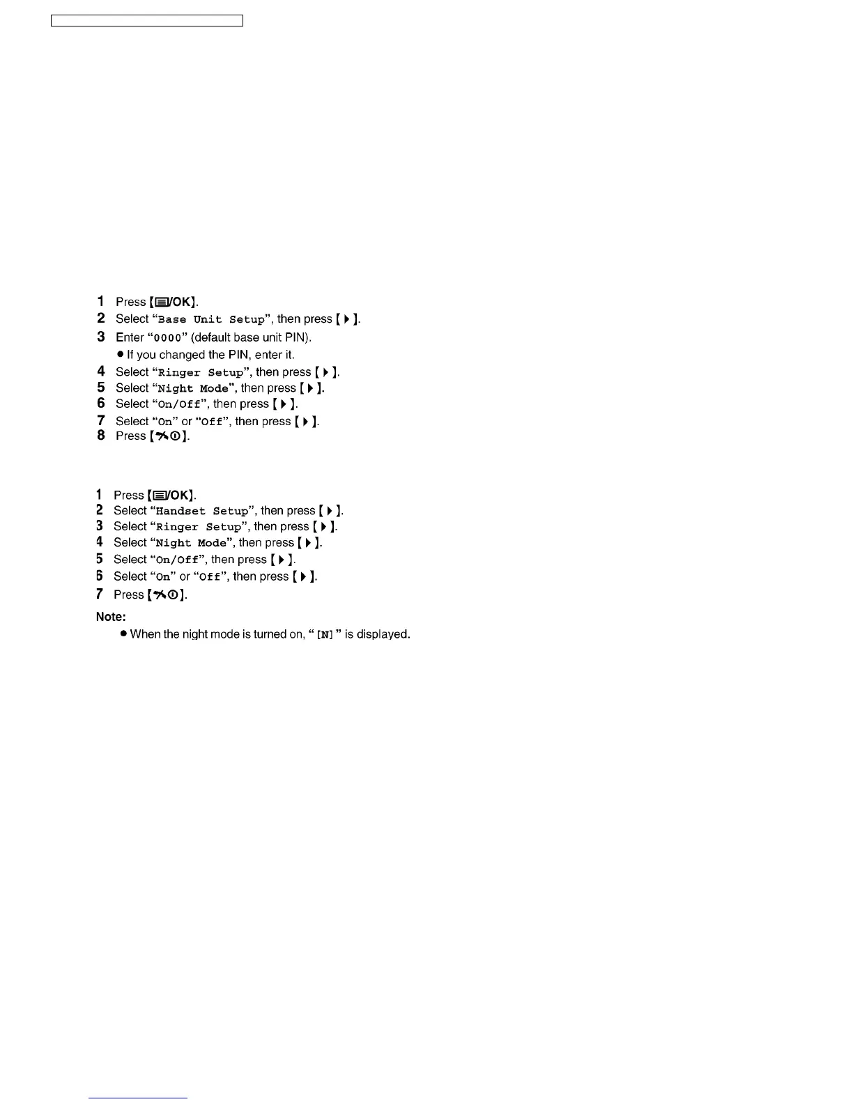 Night mode allows you to select a block of time during which the base unit and the handset will not ring for outside calls. This