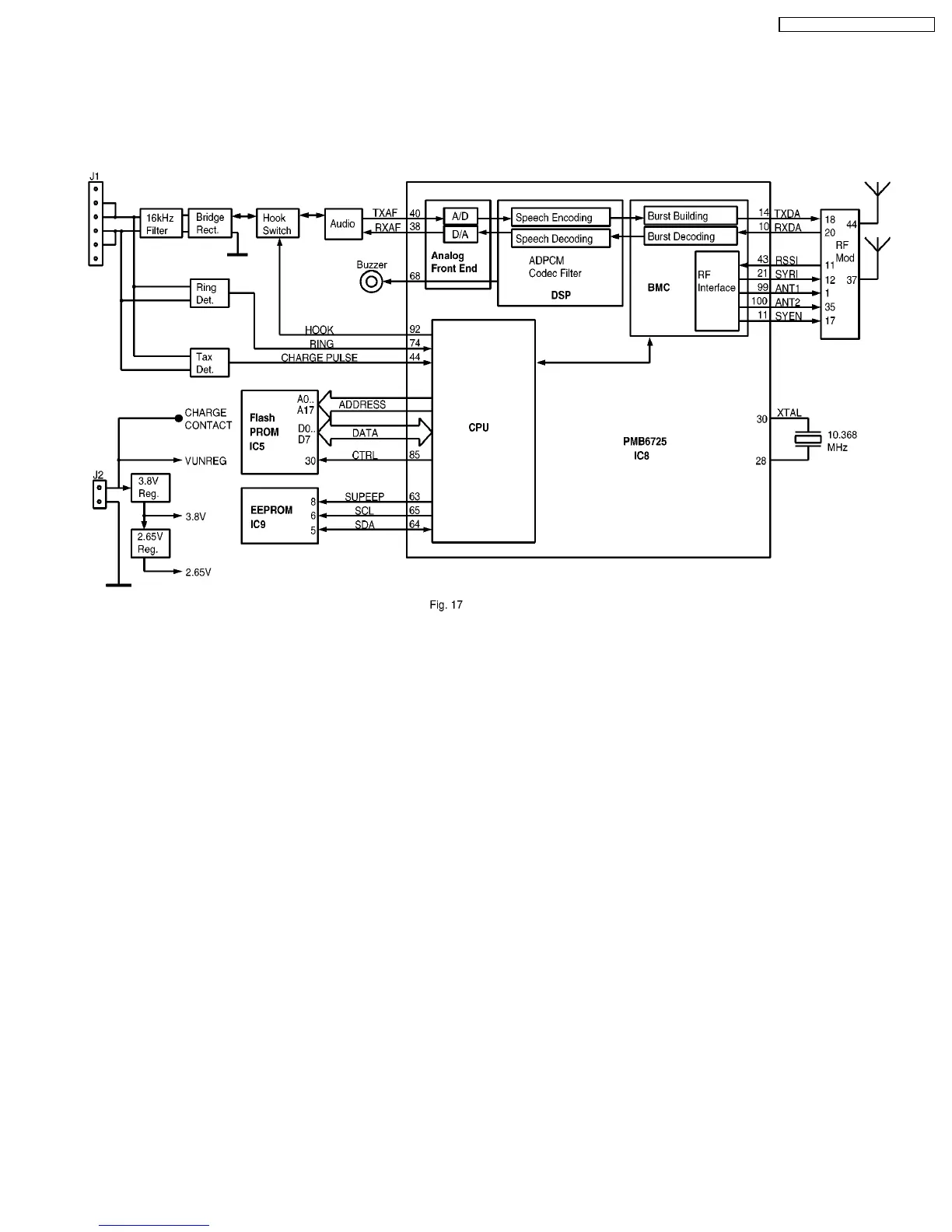 The PMB6725 (IC8) is a CMOS device designed to handle all the audio, signal and data processing needed in a DECT base