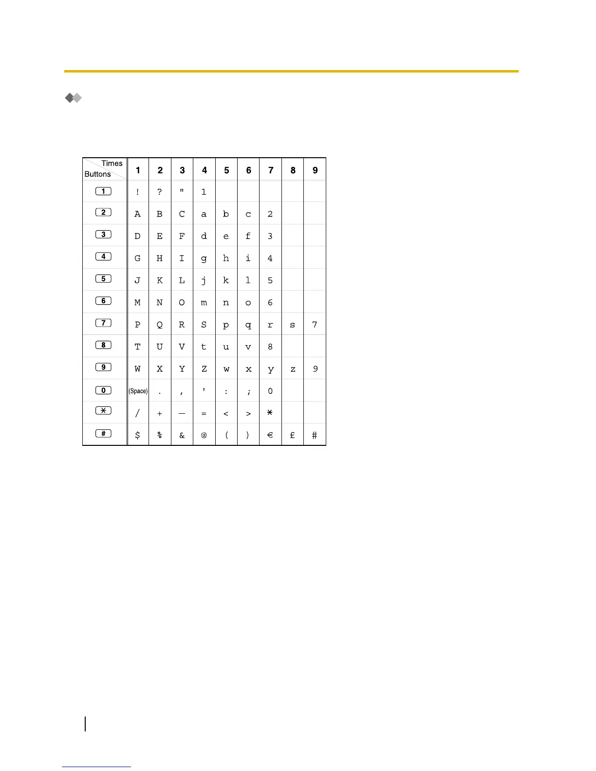 You can enter the following characters. The tables show you the characters available for each button. Table