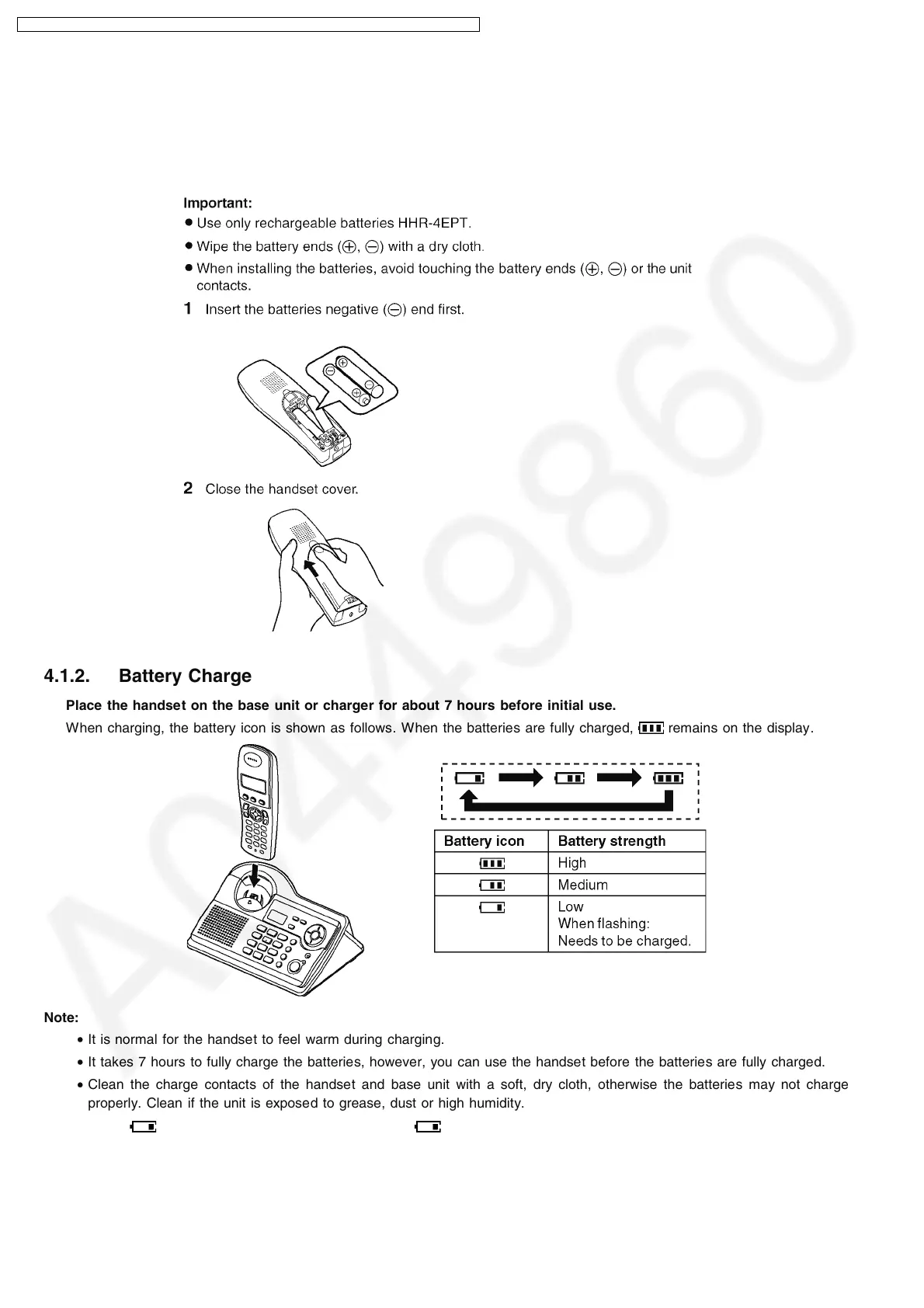 • Clean the charge contacts of the handset and base unit with a soft, dry cloth, otherwise the batteries may not charge