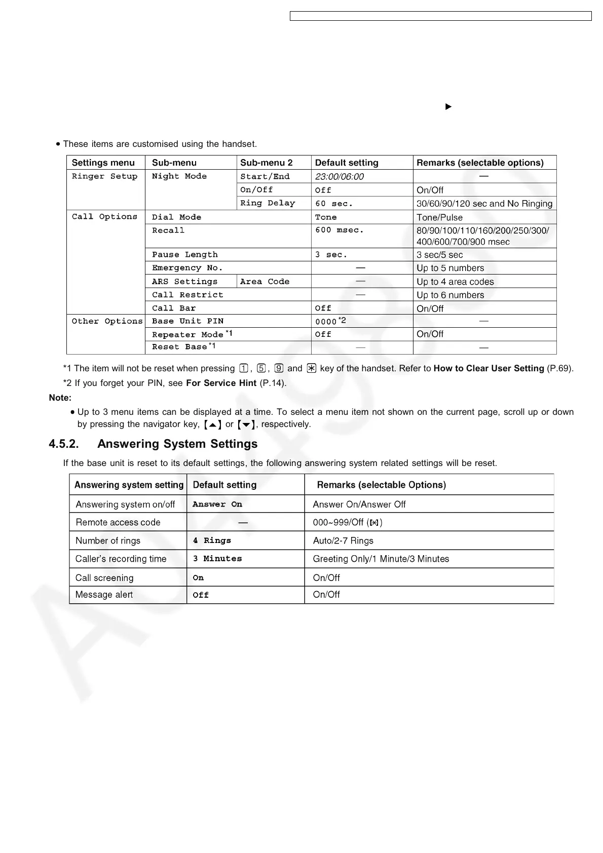 *1 The item will not be reset when pressing , , and key of the handset. Refer to How to Clear User Setting (P.69).