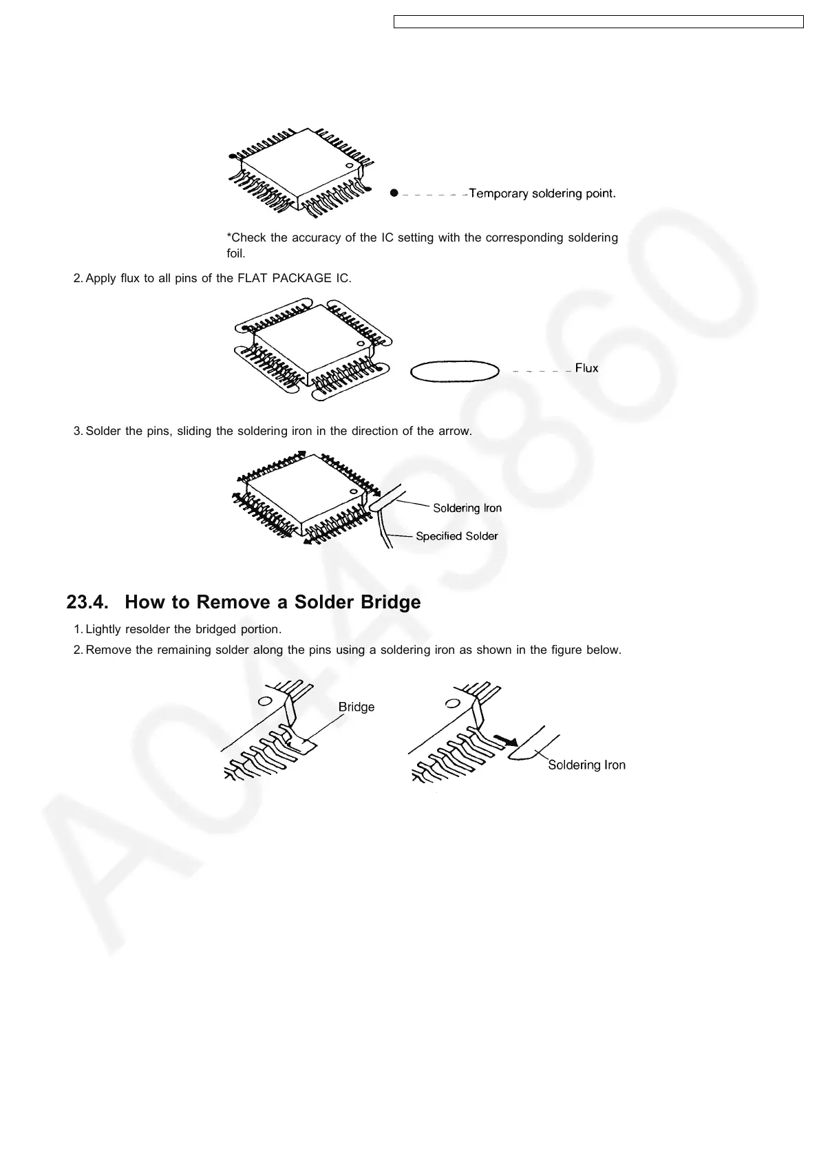 1. Temporarily fix the FLAT PACKAGE IC, soldering the two marked pins.