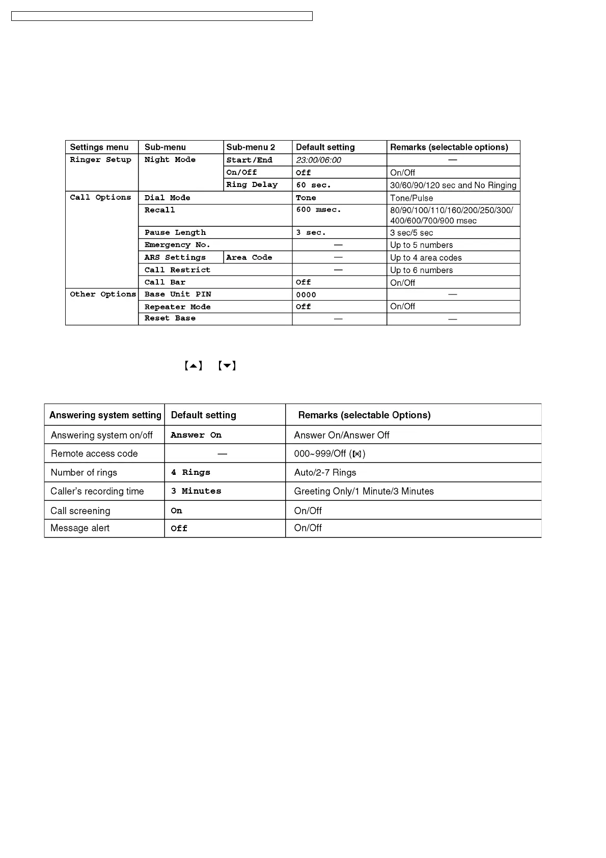 For your reference, a chart of all items which can be customised for the base unit and the handset is printed below.