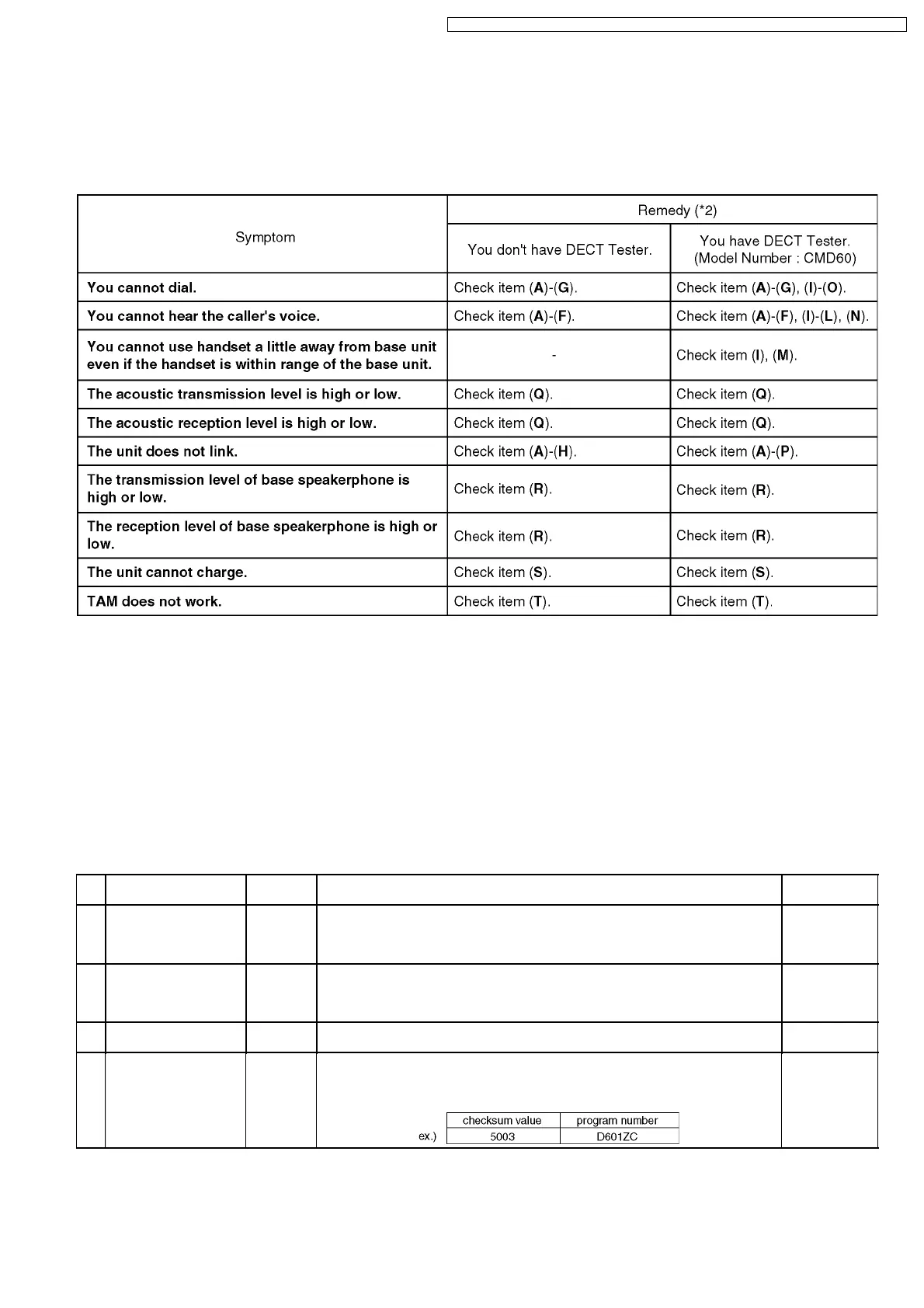 If your unit has below symptoms, follow the instructions in remedy column. Remedies depend on whether you have DECT tester
