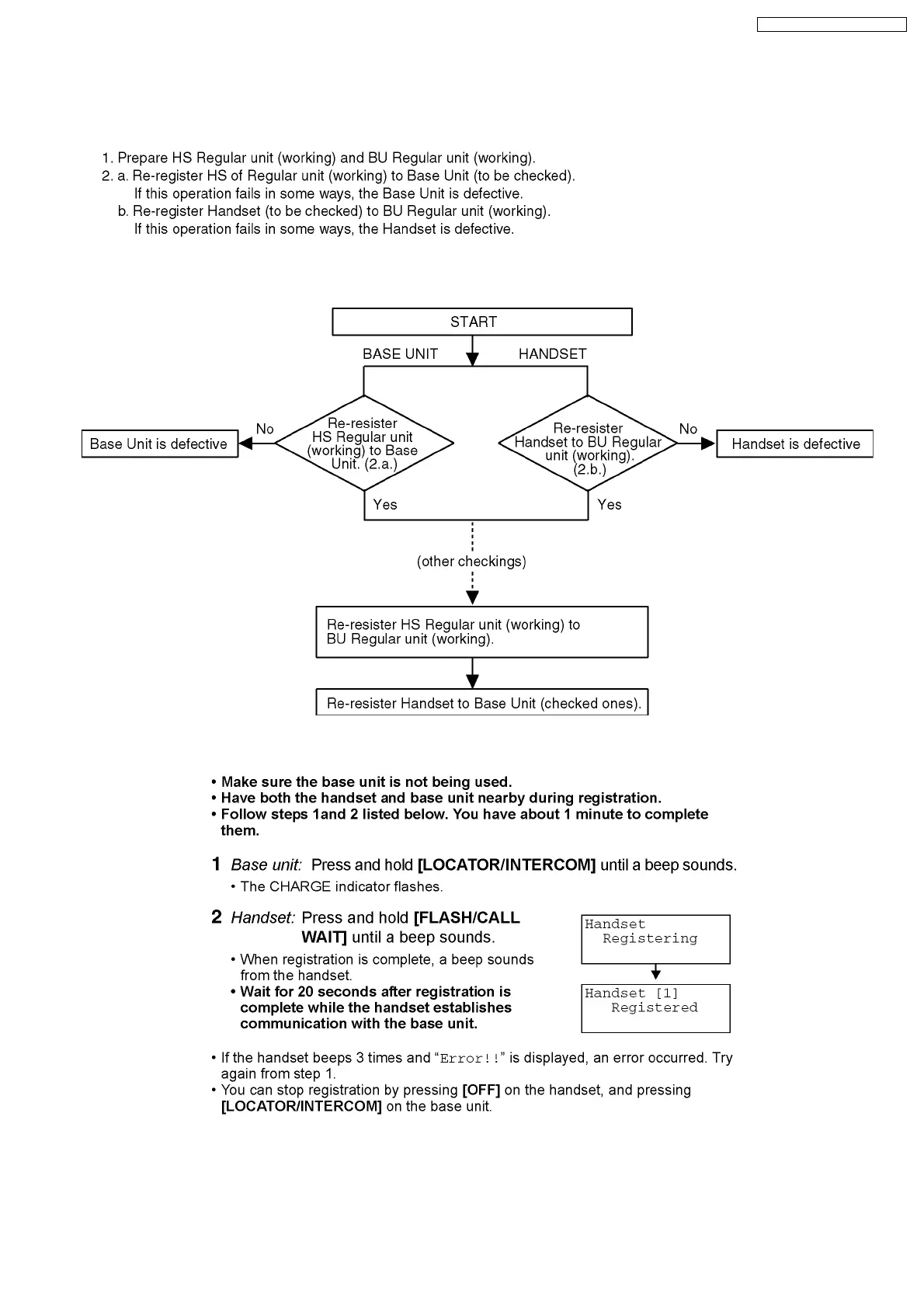 Re-register Handset (to be checked) to Base Unit (to be checked) and HS to BU Regular unit (working).