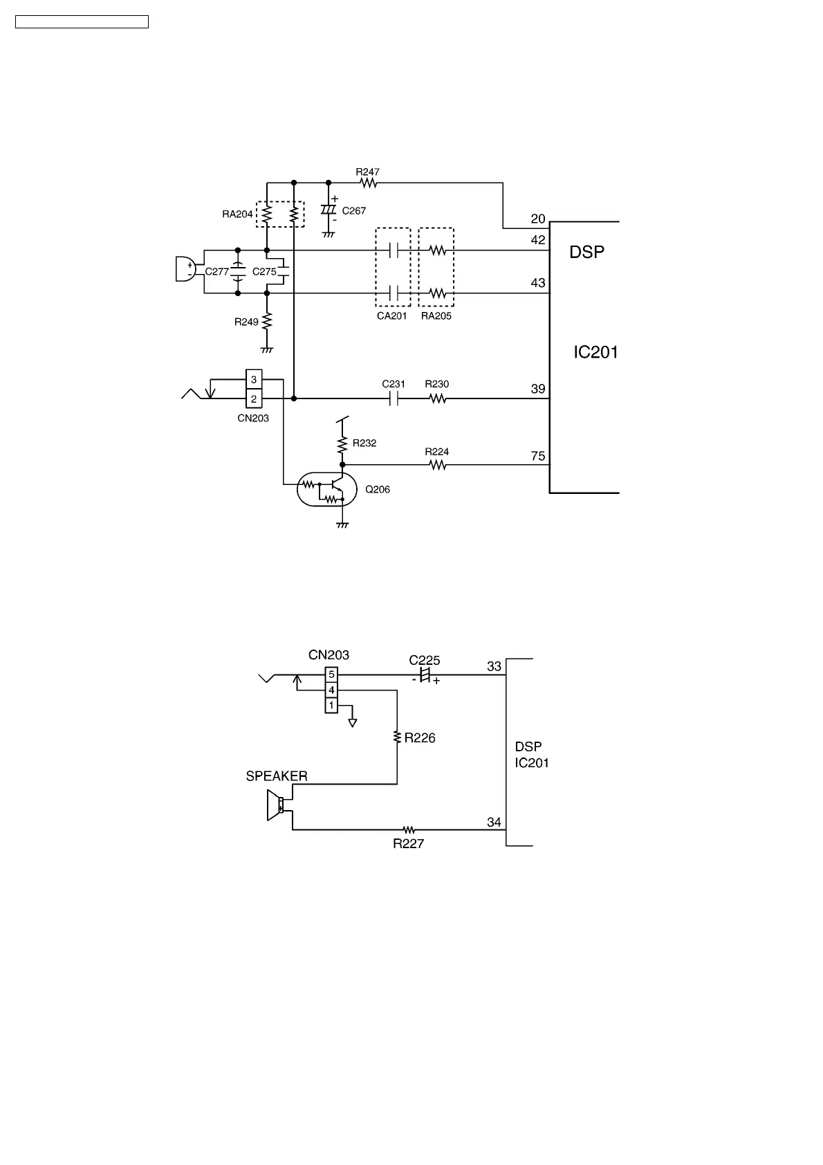 The voice signal from the microphone input to DSP (42-43). CN203 is the headset jack. When the headphone is connected, the