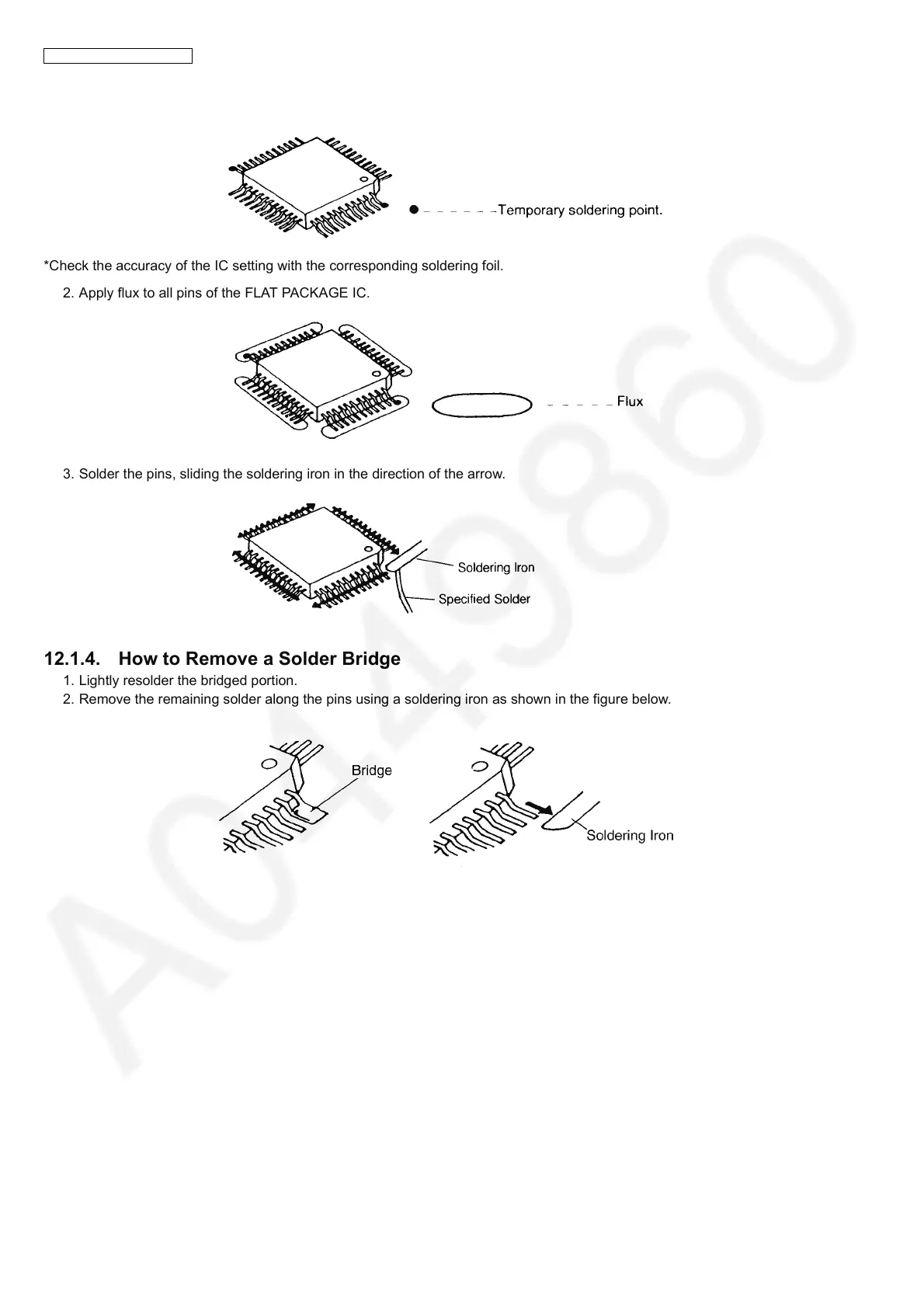 1. Temporarily fix the FLAT PACKAGE IC, soldering the two marked pins.