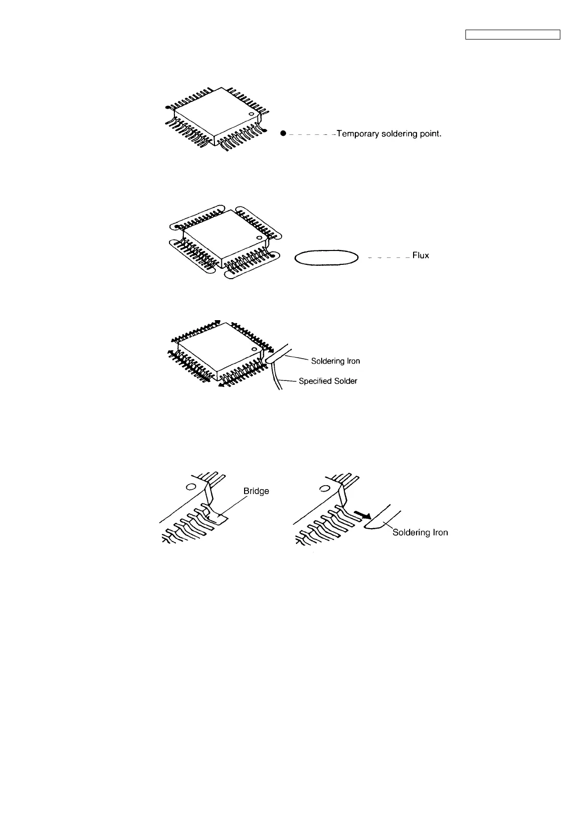 1. Temporarily fix the FLAT PACKAGE IC, soldering the two marked pins.