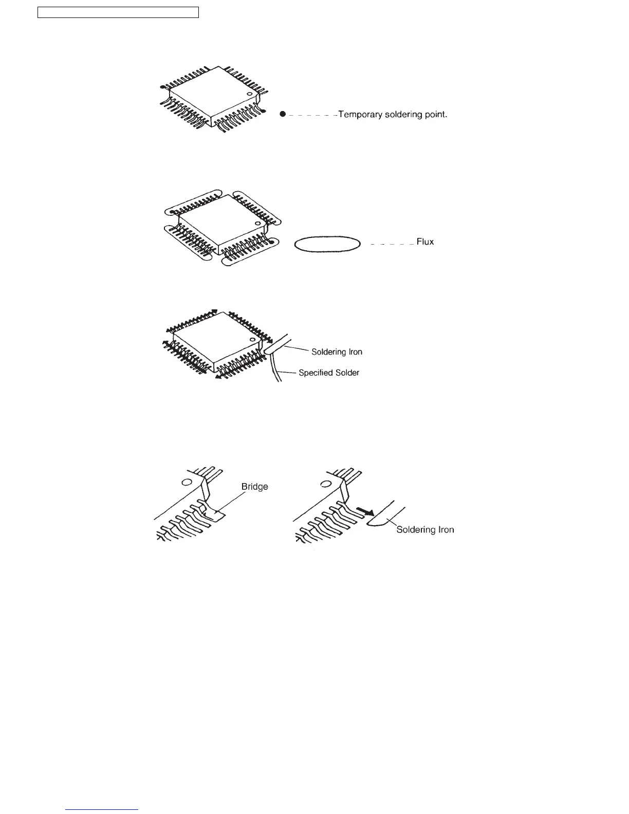 1. Temporarily fix the FLAT PACKAGE IC, soldering the two marked pins.