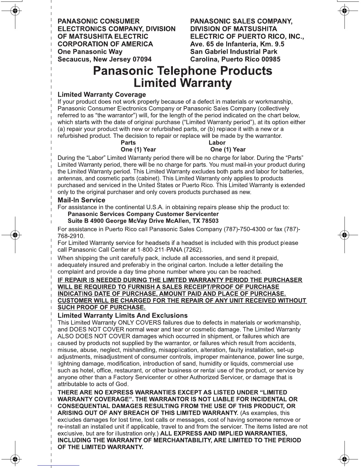 Panasonic KX-TG5230 - Product Warranty and Service; Limited Warranty Details