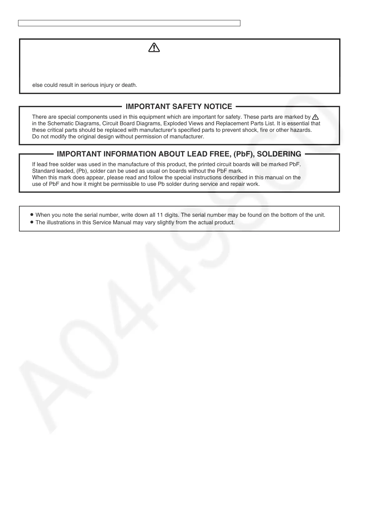 in the Schematic Diagrams, Circuit Board Diagrams, Exploded Views and Replacement Parts List. It is essential that