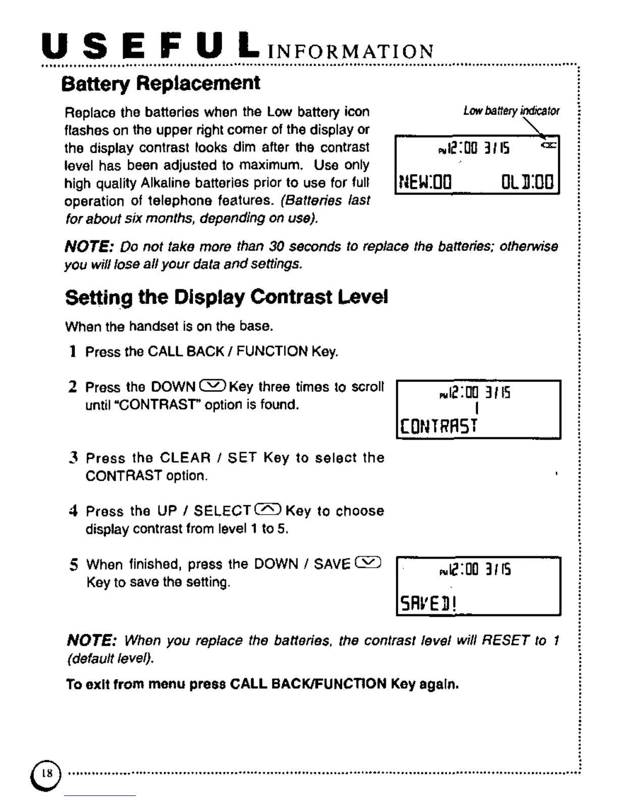 Panasonic KX-TSC7 - Useful Information; Battery Replacement; Setting the Display Contrast Level