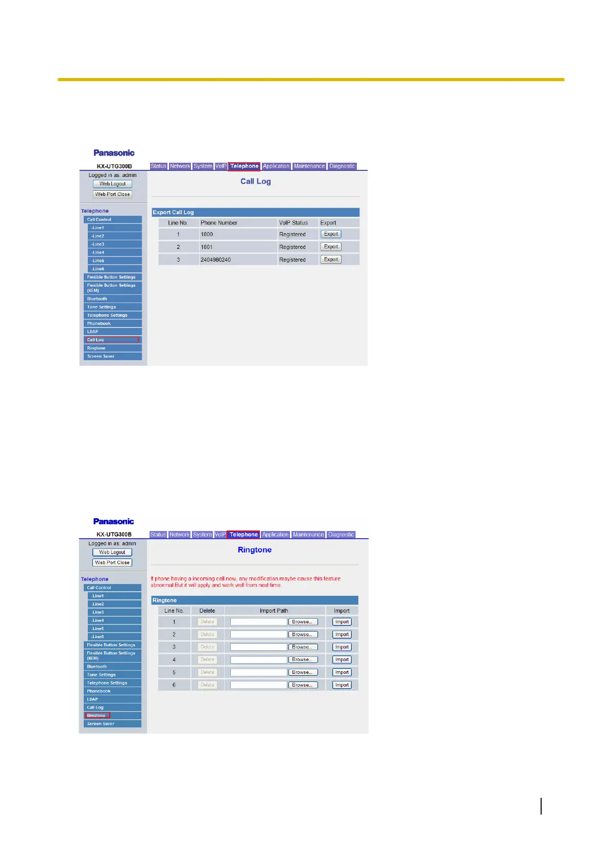 This screen allows you to import and delete ringtones for each line assigned to the unit.