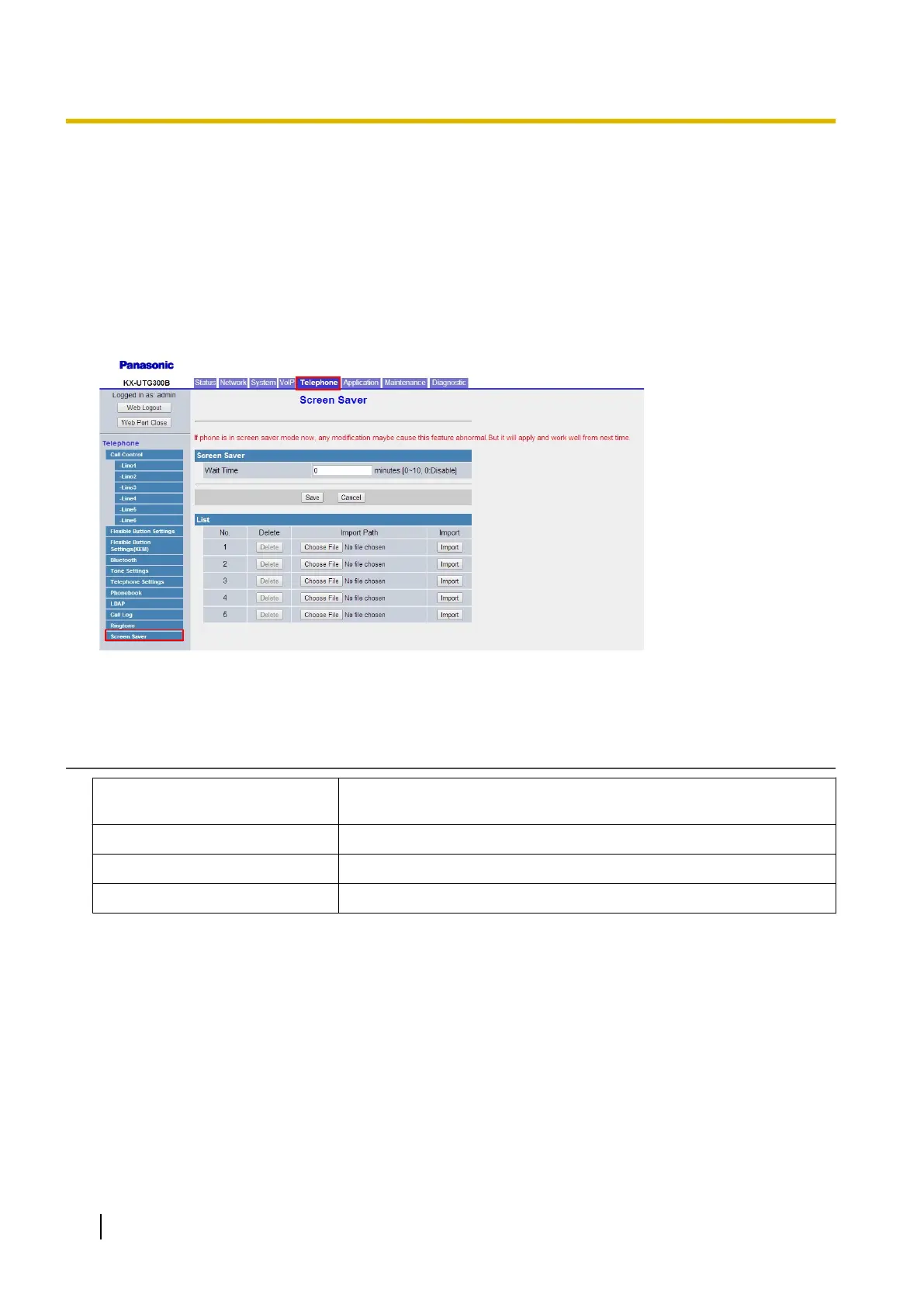 This screen allows you to import and delete screen savers for the unit, and specify the wait time before screen
