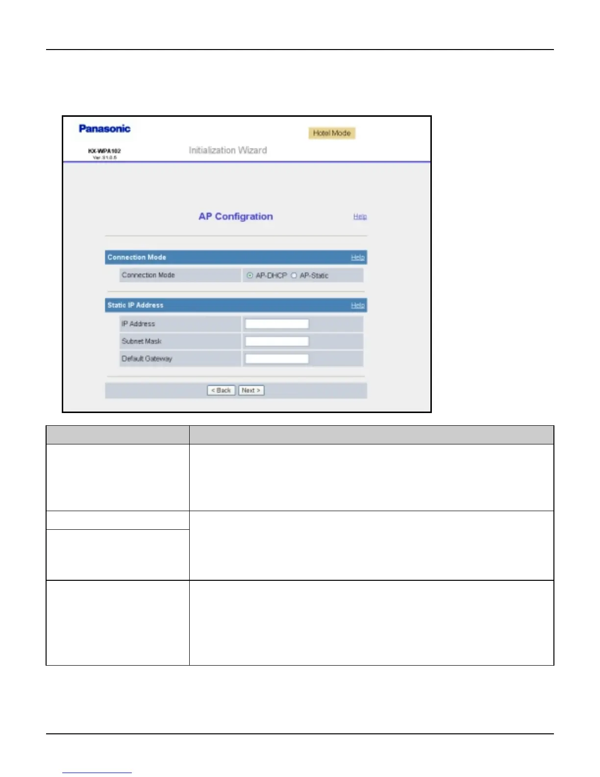 [Connection Mode] L Select AP-DHCP for Connection Mode if the DHCP server is