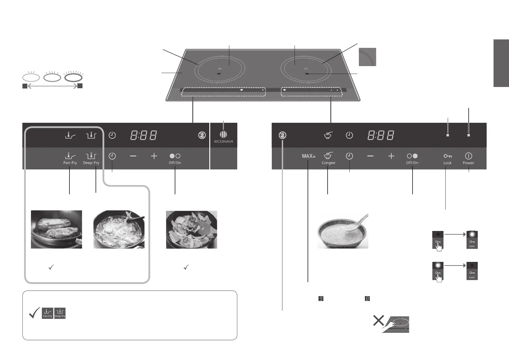 • Touch to set the heat level of the right cooking