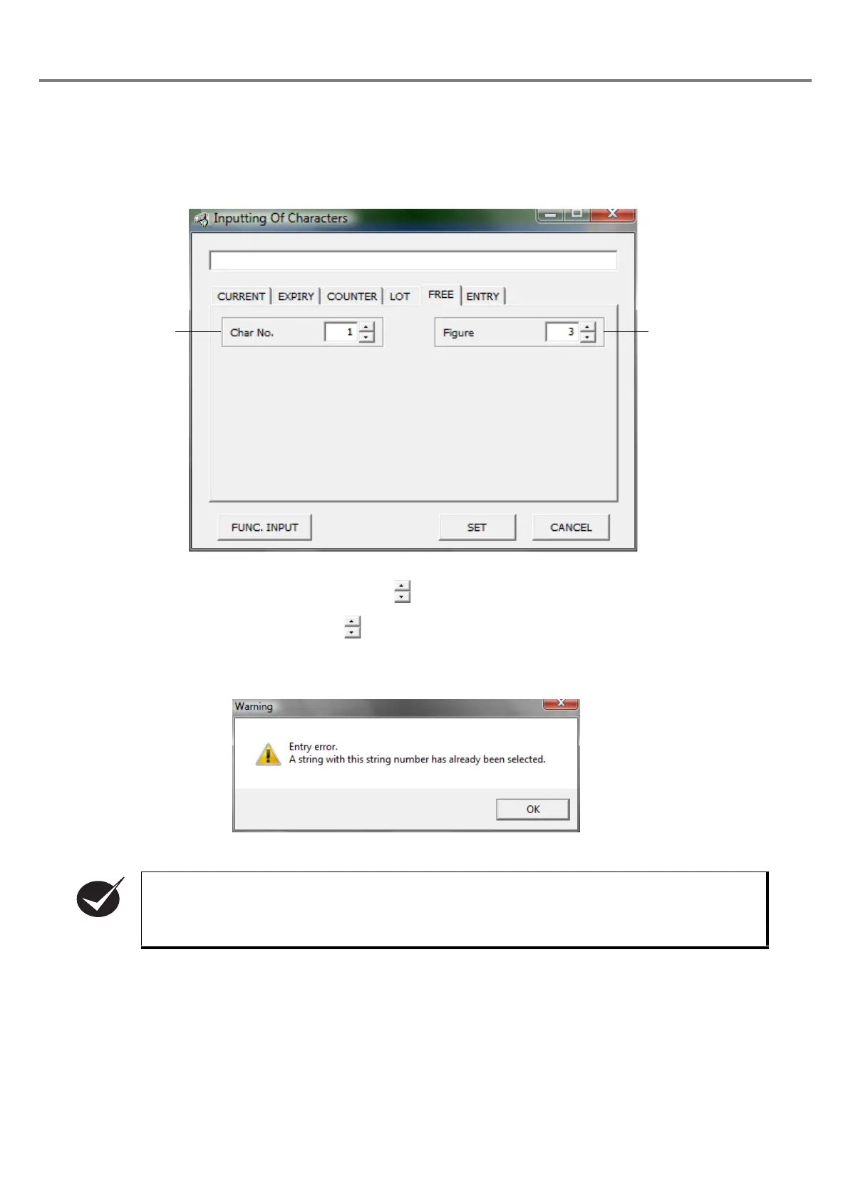 If the user tries to set the character string No. that has already been set in a file, the warning shown below is