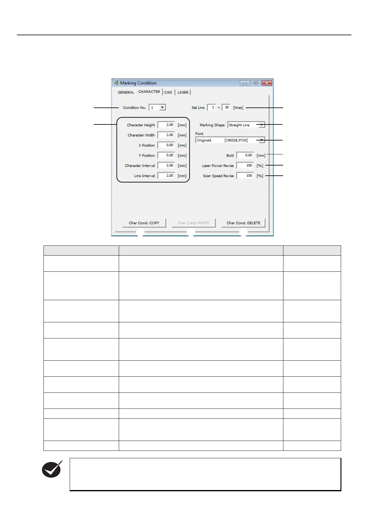 On the character setting screen, set the shape of marking, size and position of character for the marking char-
