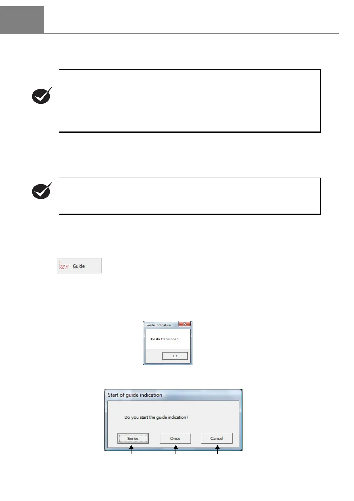 When the shutter is set to “CLOSE”, the dialog box indicating “Start of guide indication” is appeared.