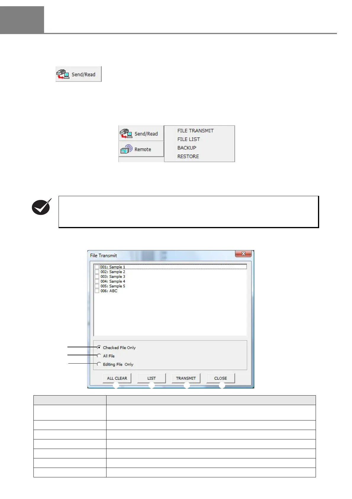 From the “Send/Read” button, the following four orations, “FILE TRANSMIT”, “FILE LIST”, “BACKUP”, and