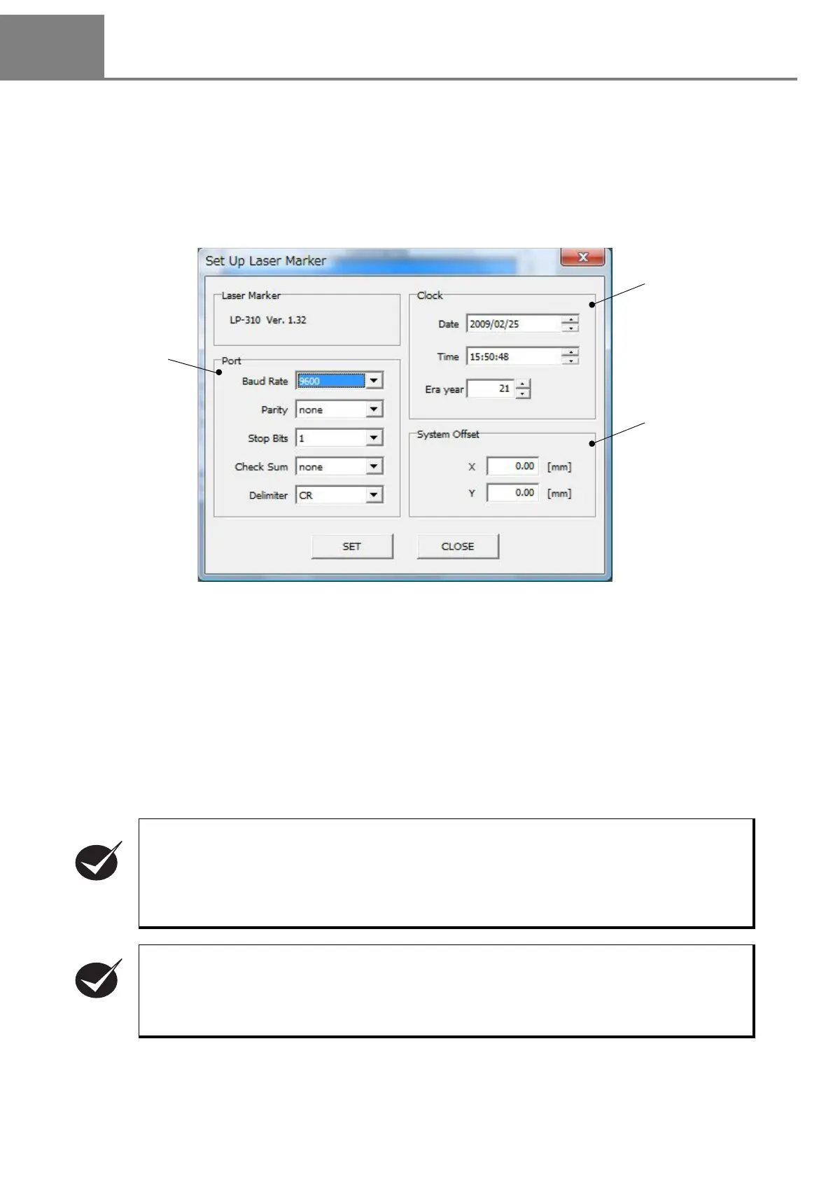 When selecting the “Laser Marker” in “File”, the “Set Up Laser Marker” dialog box is appeared. On this screen,