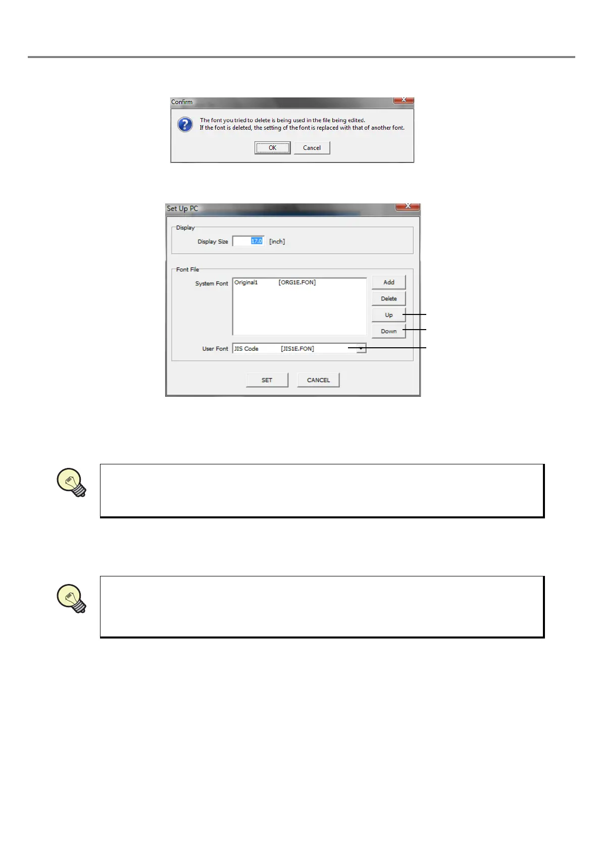 In case of deleting the font used for the file under editing from the list, the following dialog box is appeared.