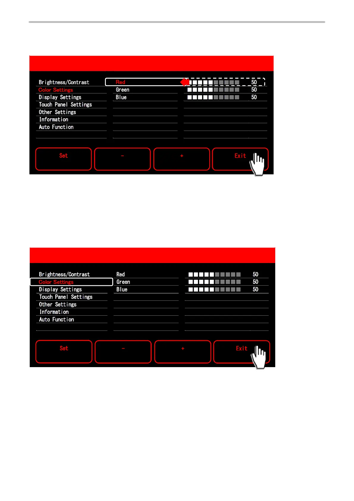 If you touch “Exit” after changing the setting value, the setting value returns to the previous value and the cursor returns to
