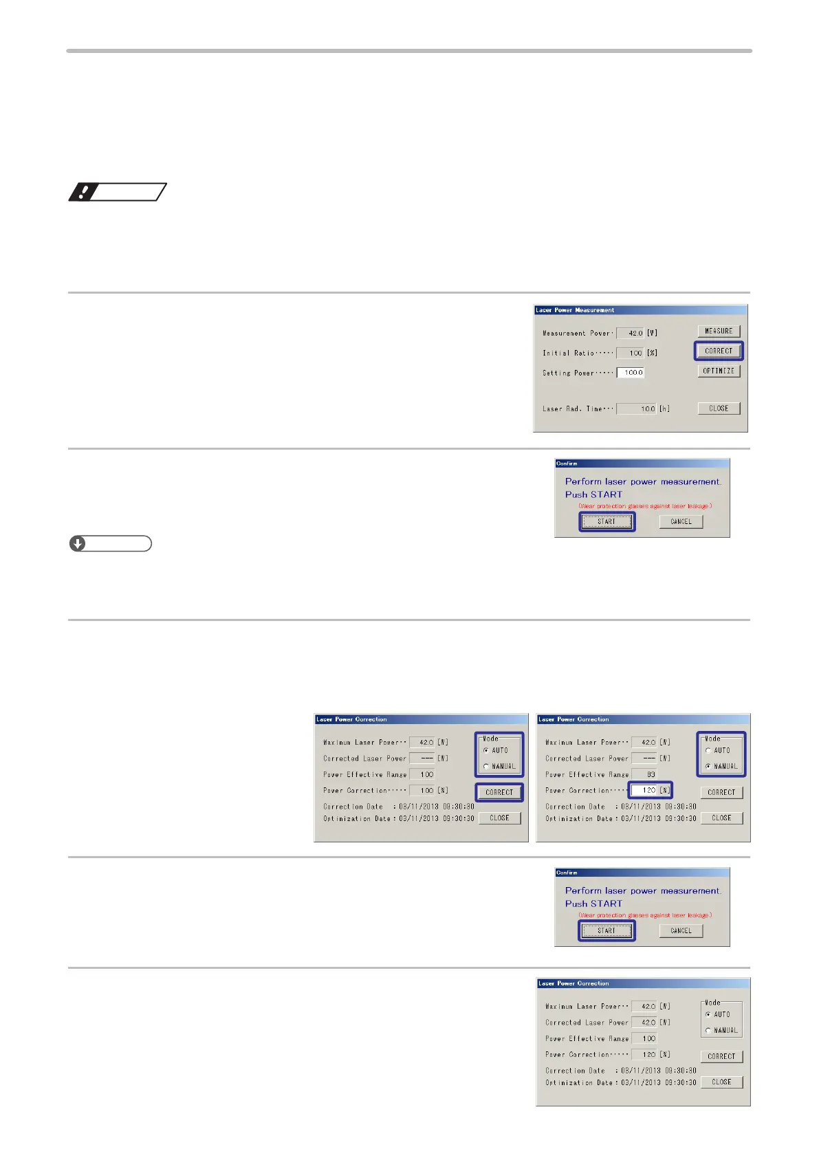 • Use “Laser Output Optimize” (P.237) function to improves the accuracy of “Laser power auto correction” after the