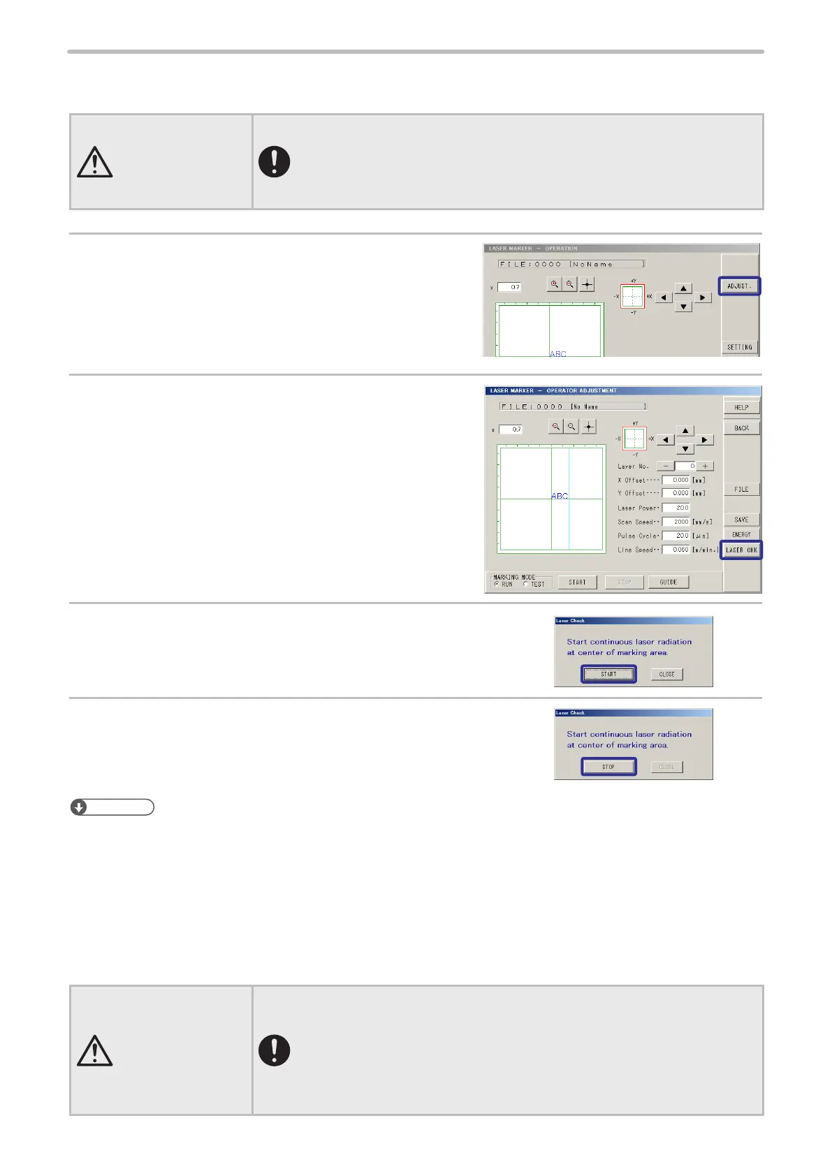• Once the laser check is started, the radiation will not be interrupted until [Stop]