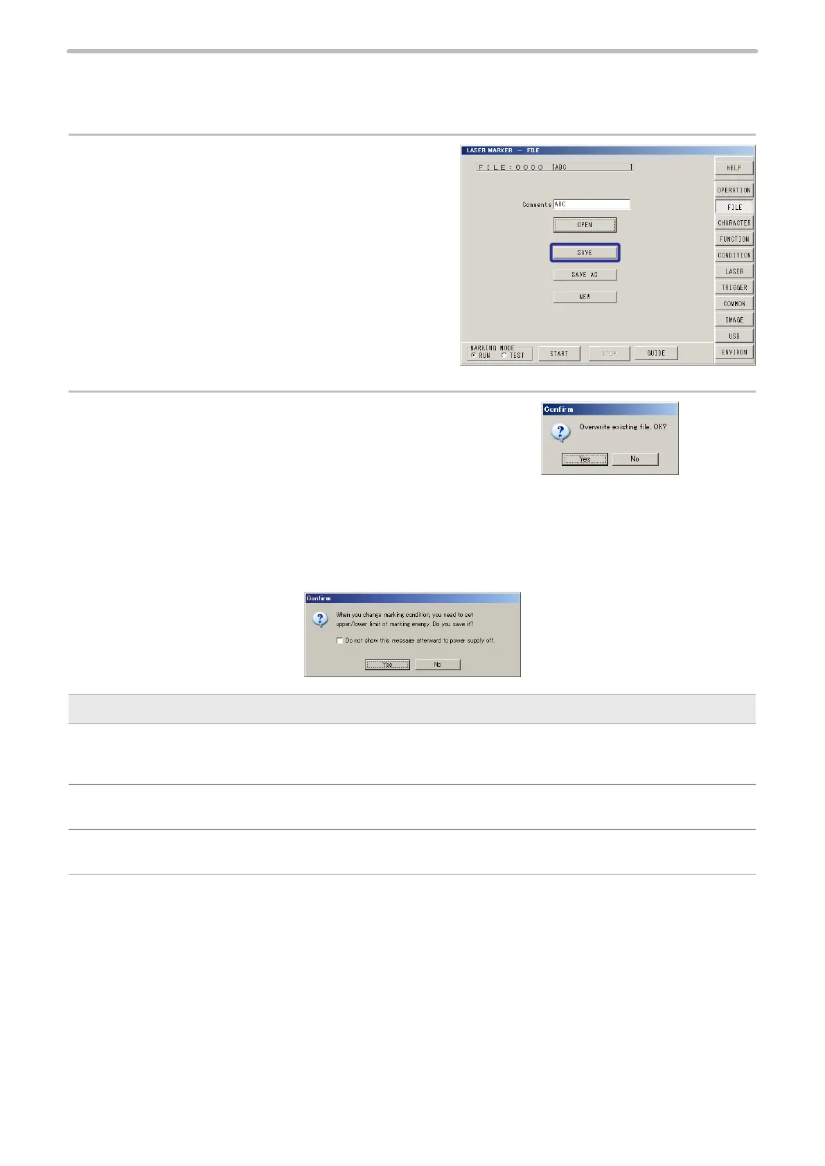 When the power of the laser marker is turned OFF without overwriting the le, the setting/changing content is not saved.