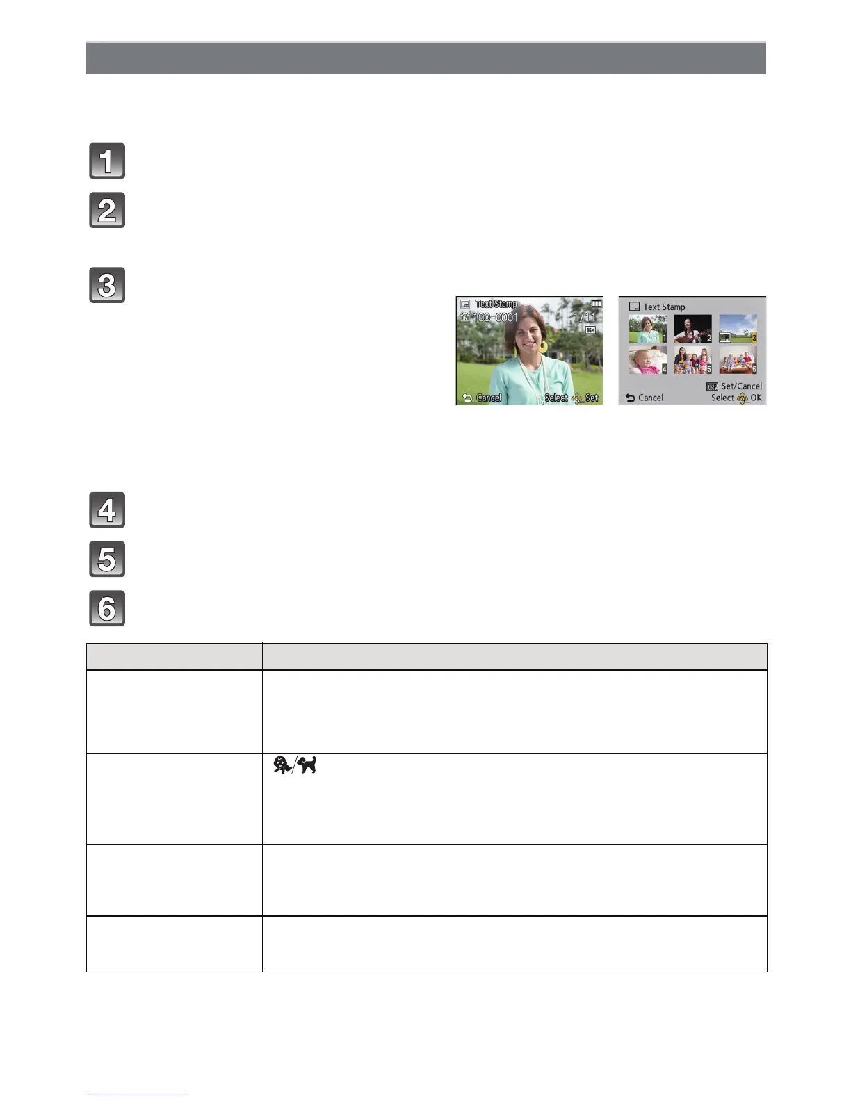 Press 3/4 to select text stamp items, and then press [MENU/SET].