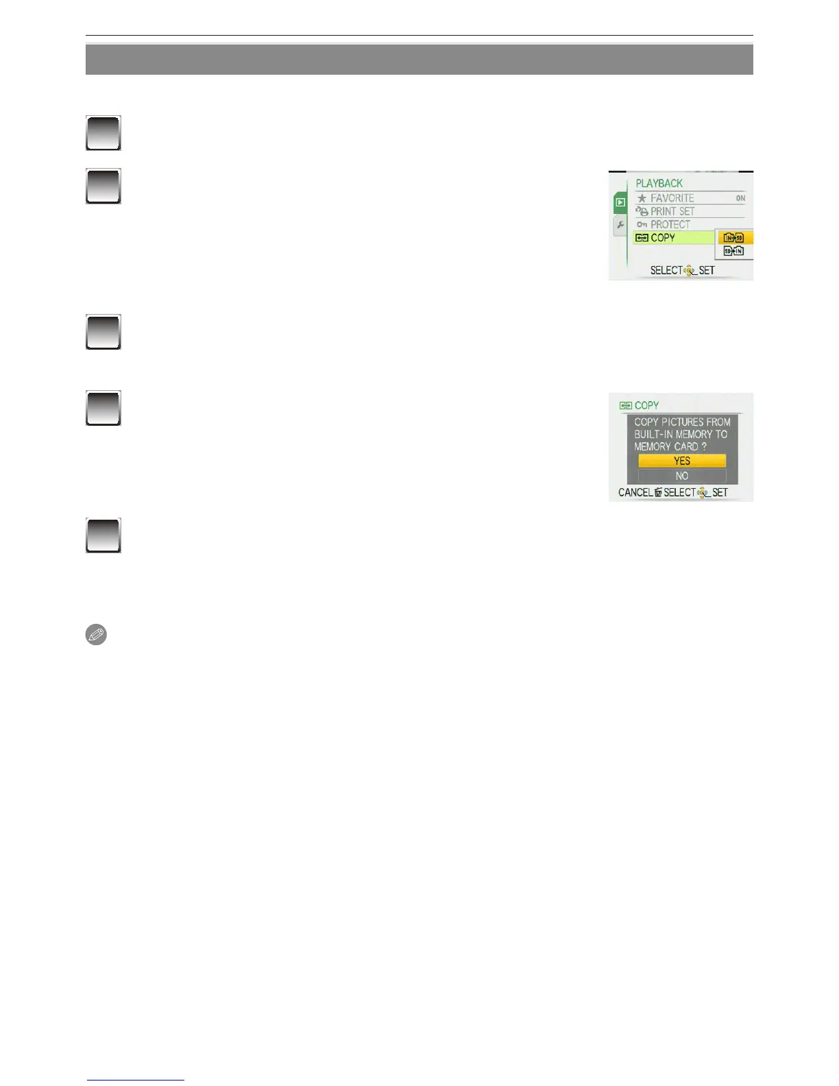 • If you copy from the built-in memory to a card, all the pictures are copied and then