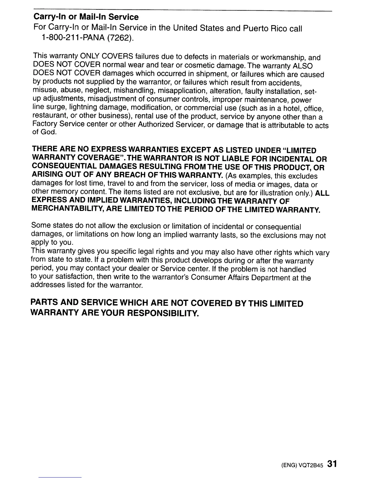 PARTS AND SERVICE WHICH ARE NOT COVERED BY THIS LIMITED