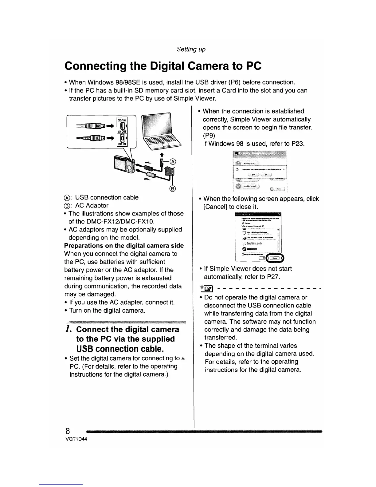 Panasonic Lumix DMC-FX12 - Connecting Camera to PC; USB Connection Setup