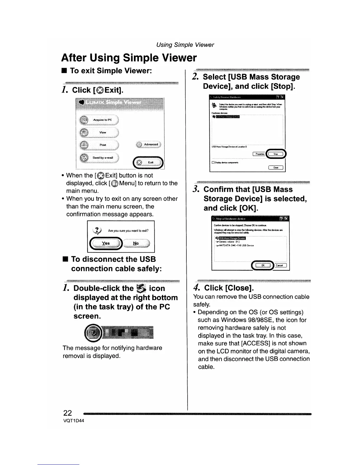 Panasonic Lumix DMC-FX12 - Exiting Simple Viewer; Exiting the Software; Stopping USB Mass Storage