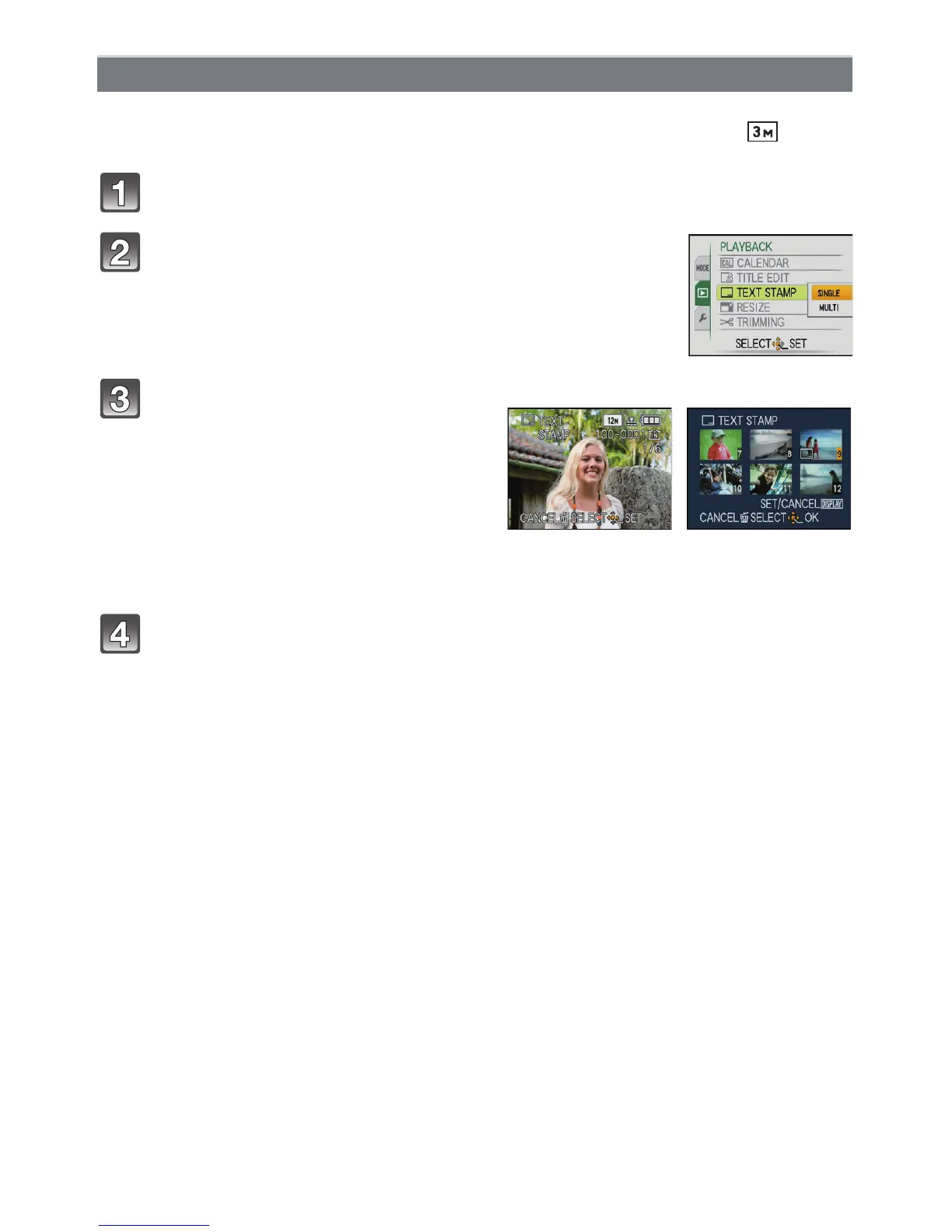 Select [TEXT STAMP] on the [PLAYBACK] mode menu. (P21)