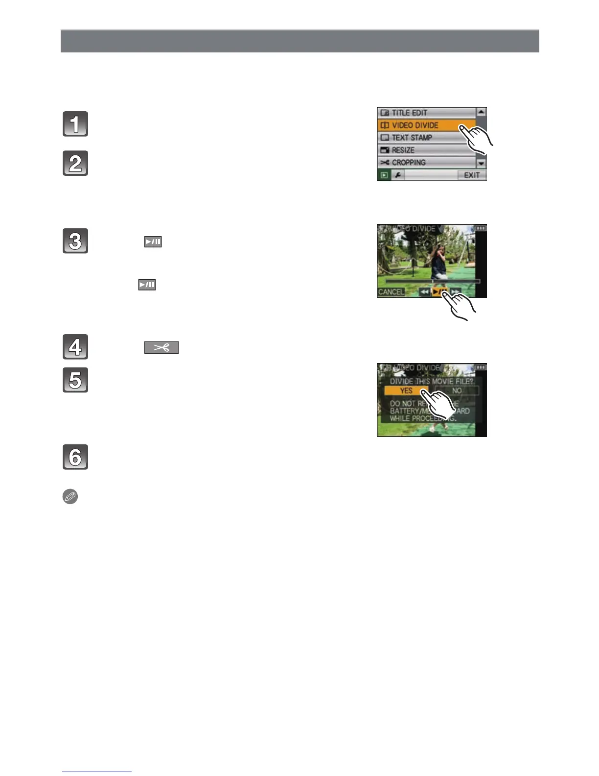 • With [MOTION JPEG] motion pictures, the order of pictures will change if divided.