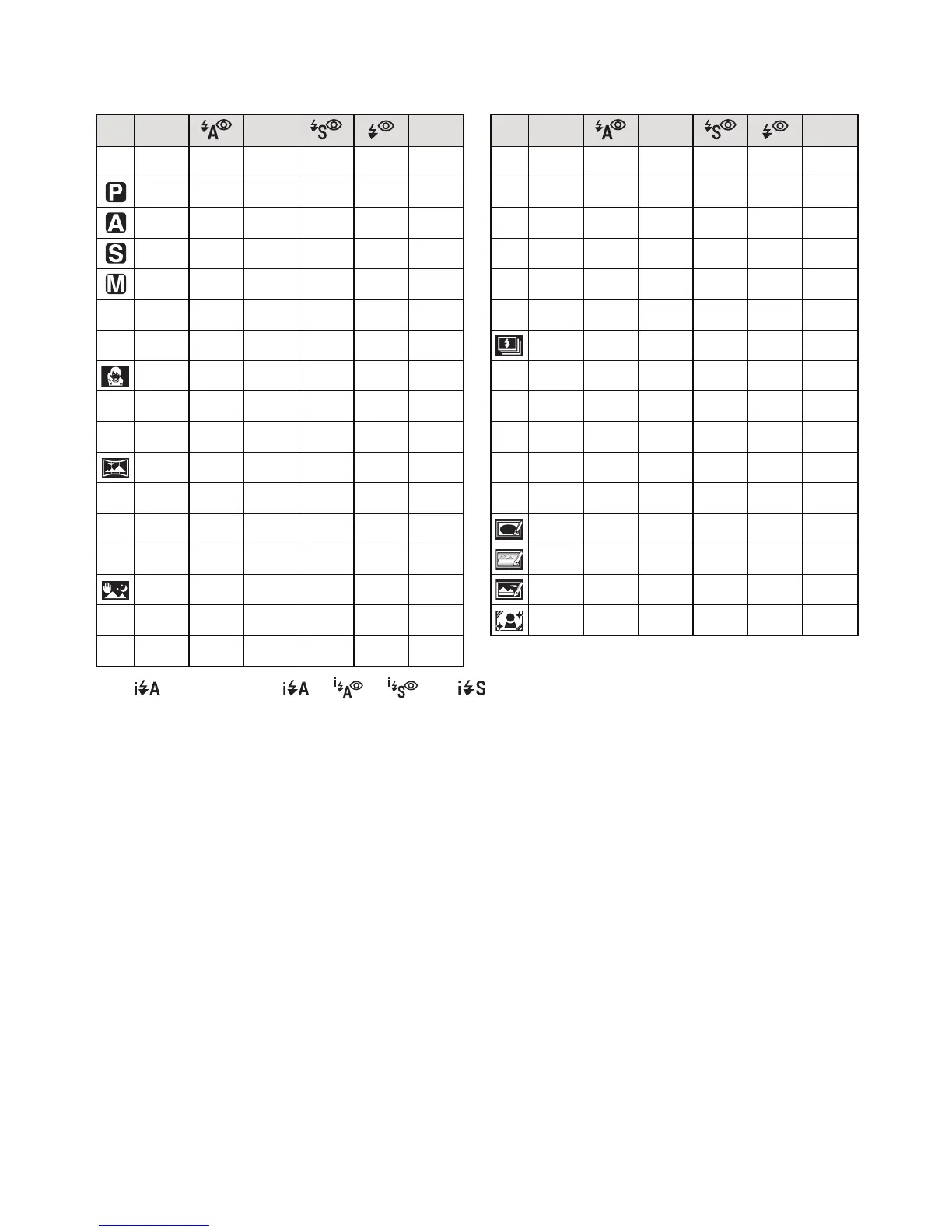 (±: Available, —: Not available, ¥: Scene Mode initial setting)