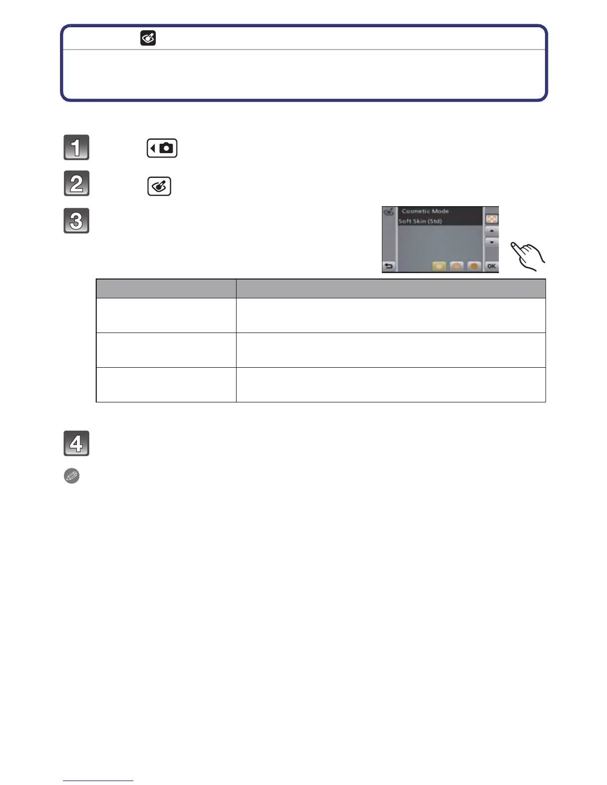• Cosmetic Mode setting set is memorized even if the camera is turned off.