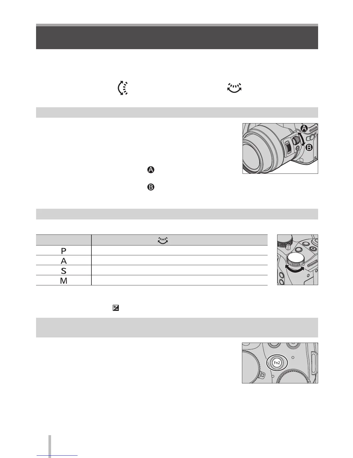 Rotate the side dial to adjust focus, and rotate the rear dial to set the aperture value and